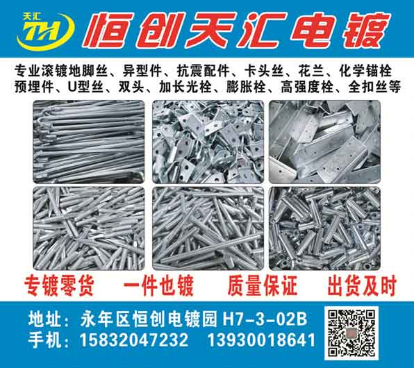 恒创天汇电镀专业滚镀地脚丝、异型件、抗震配件、卡头丝、花兰、化学锚栓预埋件、U型丝、双头、加长光栓、膨胀栓、高强度栓、全扣丝等
