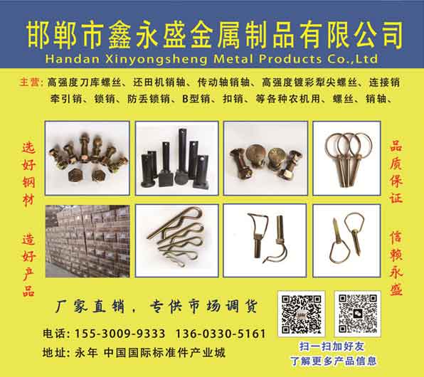 邯郸市鑫永盛金属制品有限公司主营:高强度刀库螺丝、还田机销轴、传动轴销轴、高强度镀彩犁尖螺丝、连接销牵引销、锁销、防丢锁销、B型销、扣销、等各种农机用、螺丝、销轴、