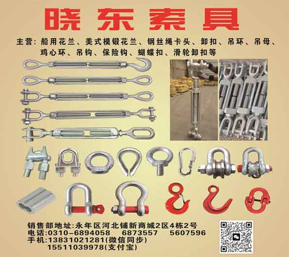 主营:船用花兰、美式模锻花兰、钢丝绳卡头、卸扣、吊环、吊母、鸡心环、吊钩、保险钩、蝴蝶扣、滑轮卸扣等