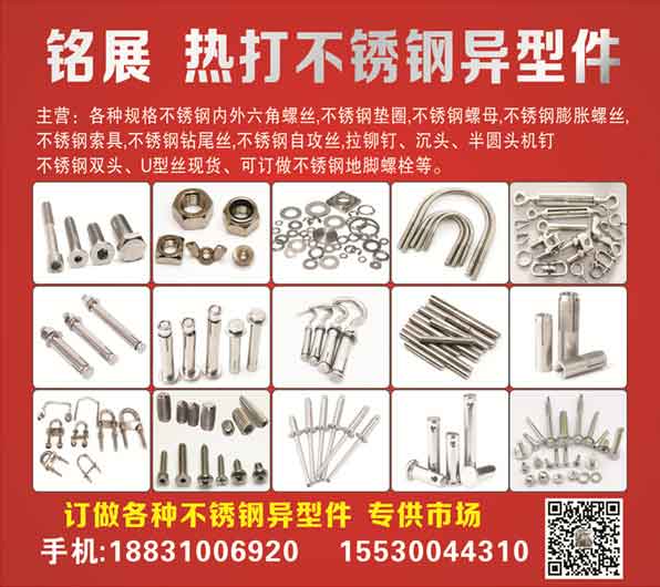 铭展热打不锈钢异型件主营:各种规格不锈钢内外六角螺丝,不锈钢垫圈,不锈钢螺母,不锈钢膨胀螺丝不锈钢索具,不锈钢钻尾丝,不锈钢自攻丝,拉铆钉、沉头、半圆头机钉不锈钢双头、U型丝现货、可订做不锈钢地脚螺栓等。
