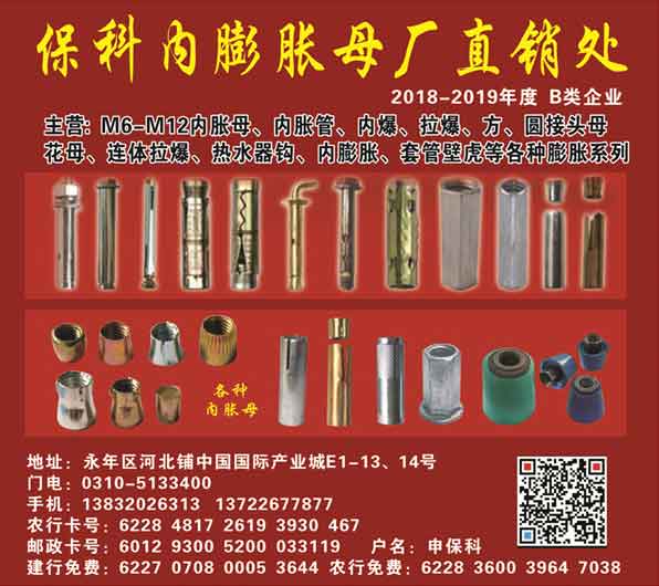 主营:M6-M12内胀母、内胀管、内爆、拉爆、方、圆接头母花母、连体拉爆、热水器钩、内膨胀、套管壁虎等各种膨胀系列