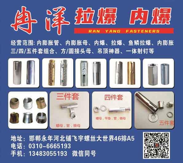 经营范围: 内膨胀管、内膨胀母、内爆、拉爆、鱼鳞拉爆、内膨胀三/四/五件套组合、方/圆接头母、吊顶神器、一体射钉等