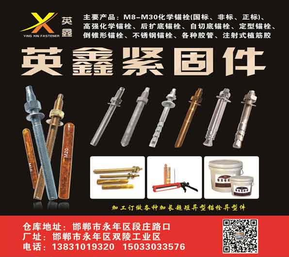 英鑫紧固件主要产品:M8-M30化学锚栓(国标、非标、正标)、高强化学锚栓、后扩底锚栓、自切底锚栓、定型锚栓:倒锥形锚栓、不锈钢锚栓、各种胶管、注射式植筋胶