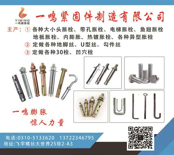 一鸣紧固件制造有限公司主产:各种大小头胀栓、带孔胀栓、电梯胀栓、鱼翅胀栓、地板胀栓、内膨胀、热镀胀栓、各种异型胀栓