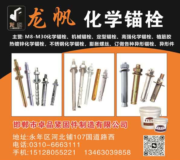 主营:M8-M30化学锚栓、机械锚栓、定型锚栓、高强化学锚栓、植筋胶热镀锌化学锚栓,不锈钢化学锚栓,膨胀螺丝、订做各种异形锚栓、异形件