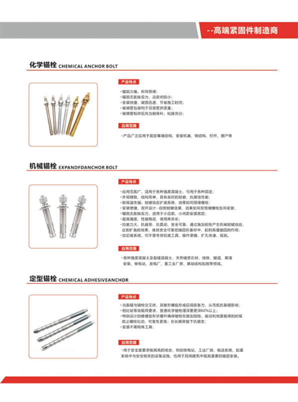 M8-M36化学锚栓、机械锚栓、定型锚栓、高强度化学锚栓、热镀锌化学锚栓、不锈钢化学锚栓、水泥自切锚栓、注射式植筋胶、定做各种异型锚栓。