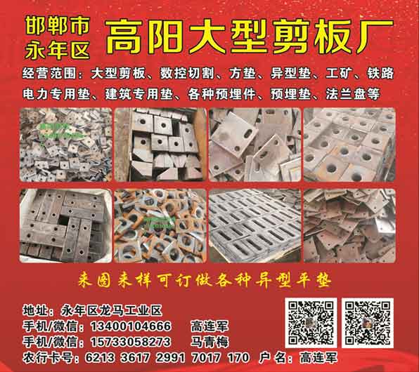 邯郸市永年区高阳大型剪板厂经营范围:大型剪板、数控切割、方垫、异型垫、工矿、铁路电力专用垫、建筑专用垫、各种预埋件、预埋垫、法兰盘等