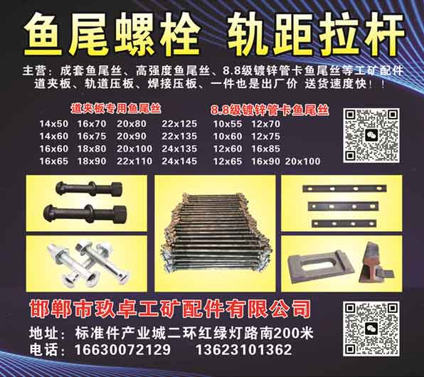 主营:成套鱼尾丝、高强度鱼尾丝、8.8级镀锌管卡鱼尾丝等工矿配件道夹板、轨道压板、焊接压板、一件也是出厂价送货速度快!