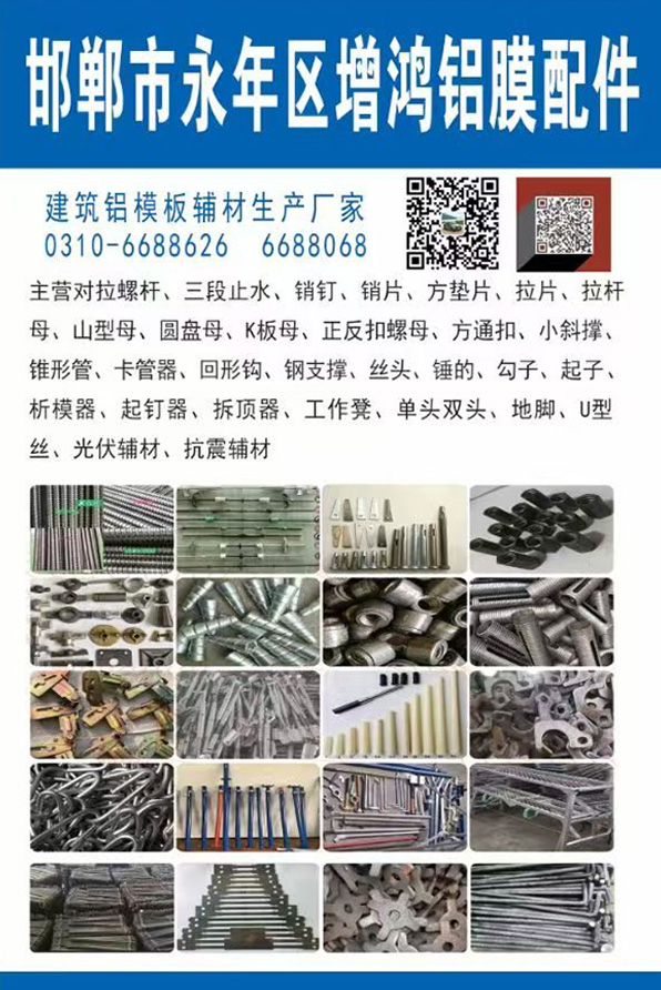 主营对拉螺杆、三段止水、销钉、销片、方垫片、拉片、拉杆母、山型母、圆盘母、K板母、正反扣螺母、方通扣、小斜撑、锥形管、卡管器、回形钩、钢支撑、丝头、锤的、勾子、起子,析模器、起钉器、拆顶器、工作凳、单头双头、地脚、U型丝、光伏辅材、抗震辅材