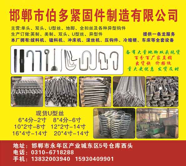 主营:单头、双头、U型丝、地脚、全扣丝及各种异型钩件