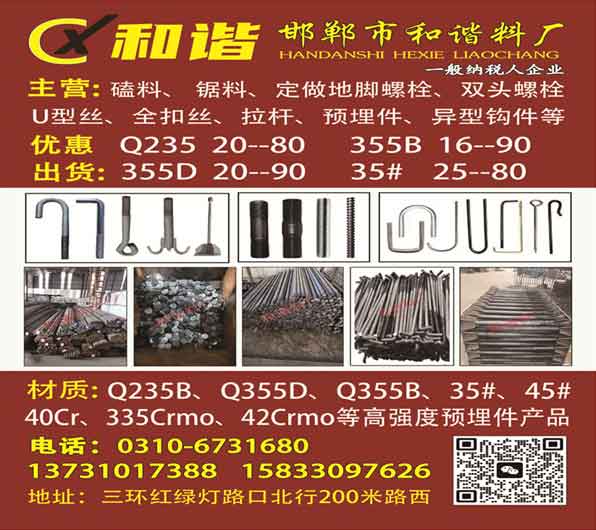 主营:磕料、锯料、定做地脚螺栓、双头螺栓 U型丝、全扣丝、拉杆、预埋件、异型钩件等