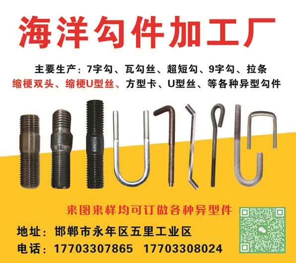 主要生产:7字勾、瓦勾丝、超短勾、9字勾、拉条缩梗双头、缩梗U型丝、方型卡、U型丝、等各种异型勾件