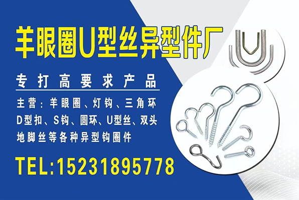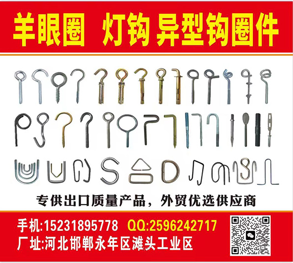 羊眼圈 异型钩件厂本厂专业生产m3-m36英美制,羊眼圈,羊眼钉,灯钩,灯勾,冲孔,压钩,瓦钩,羊眼螺丝,吊环,拍扁,圆环, 螺栓,木牙羊眼圈,羊眼圈膨胀壁虎,热水器钩,焊接缩杆羊眼圈,羊眼钉,灯钩,猪尾钩,帐篷钉,折钉,S钩,D型环,方型环,三角环,圆环,拍扁折钉,机木双头,瓦钩丝,自攻钉,把手,三角头螺丝,光伏配件,光伏U型卡,U型丝,地脚螺栓,预埋件等各种异型钩圈件非标件