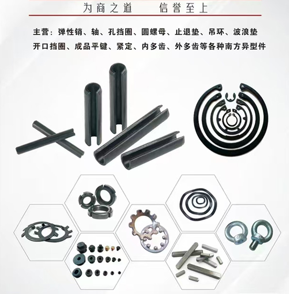 主营:弹性销、轴、孔挡圈、圆螺母、止退垫、吊环、波浪垫开口挡圈、成品平键、紧定、内多齿、外多齿等各种南方异型件
