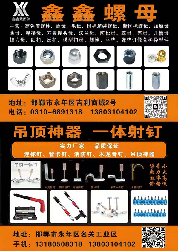 鑫鑫螺母主营:高强度螺栓、螺母、毛母、国标箱装螺母、新国标螺母、加厚母、薄母、焊接母、方圆接头母、法兰母、防松母、蝶母、盖母、开槽母、扭力母、细扣、反扣、梯型扣母、螺栓、平垫、弹垫订做各种异型件