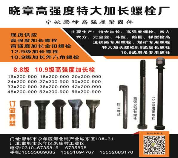 主要生产:特大加长、高强度螺栓、四方六方、元宝丝、斗型、鹅蛋、梯型栓高