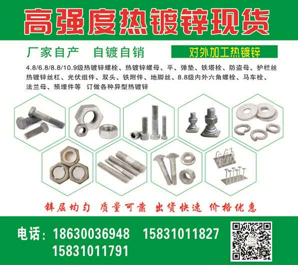 4.8/6.8/8.8/10.9级热镀锌螺栓、热镀锌螺母、平、弹垫、铁塔栓、防盗母、护栏丝热镀锌丝杠、光伏组件、双头、铁附件、地脚丝、8.8级内外六角螺栓、马车栓、法兰母、预埋件等订做各种异型热镀锌