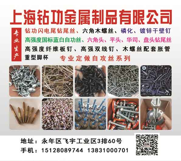 上海钻功金属制品有限公司钻功闪电尾钻尾丝、六角木螺丝、磷化、镀锌干壁钉 高强度国标蓝白自功丝、六角头、平头、华司、盘头钻尾丝高强度纤维板钉、高强双线钉、木螺丝配套胀管 重型脚杯