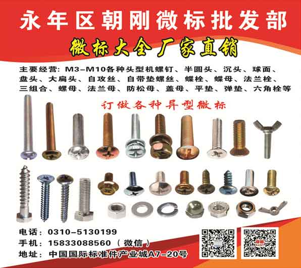 永年区朝刚微标批发主要经营:M3-M10各种头型机螺钉、半圆头、沉头、球面、盘头、大扁头、自攻丝、自带垫螺丝、蝶栓、蝶母、法兰栓、三组合、螺母、法兰母、防松母、盖母、平垫、弹垫、六角栓等