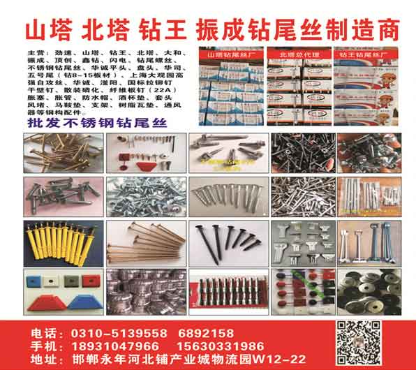主营:劲速、山塔、钻王、北塔、大和、振成、顶创、鑫钻、闪电、钻尾螺丝、不锈钢钻尾丝、华诚平头、盘头、华司、五号尾(钻8-15板材)、上海大观园高强自攻丝、华诚、滏阳、国标拉铆钉,干壁钉、散装磷化、纤维板钉(22A)胀惠、胀管、防水帽、酒杯垫、套头风堵、马鞍垫、支架、树腊瓦垫、通风器等钢构配件
