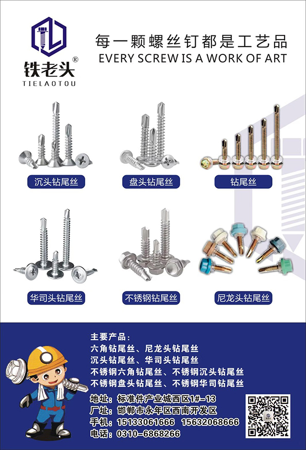 主要产品:六角钻尾丝、尼龙头钻尾丝、沉头钻尾丝、华司头钻尾丝、不锈钢六角钻尾丝、不锈钢沉头钻尾丝、不锈钢盘头钻尾丝、不锈钢华司钻尾丝